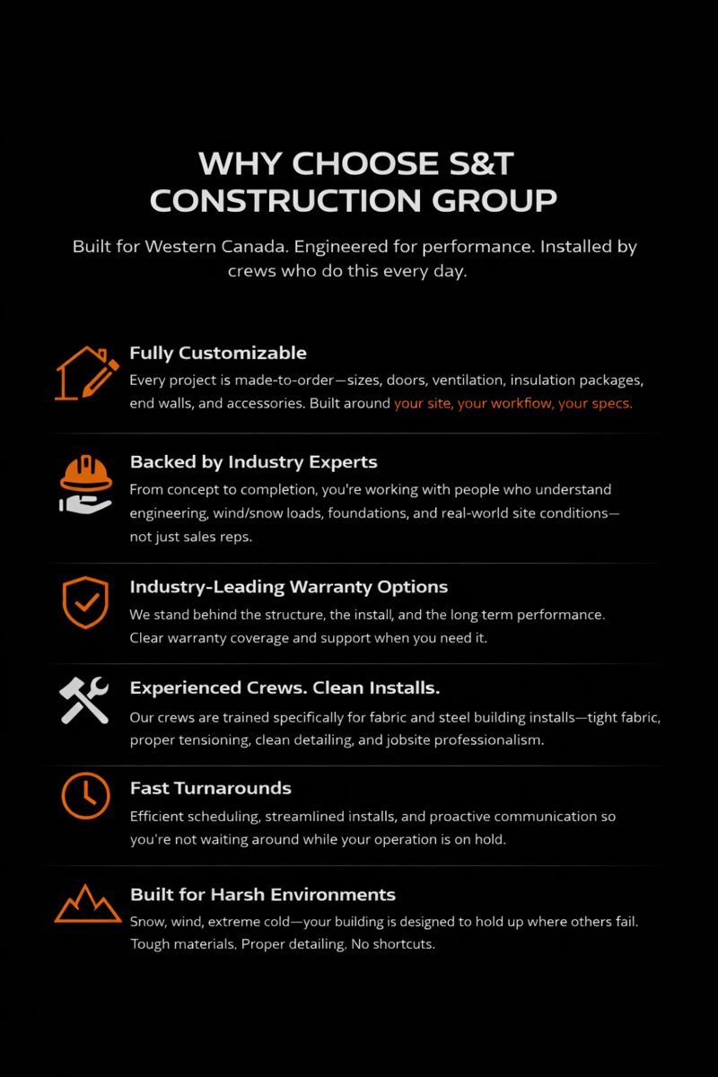 S&T Construction Group provides fabric building installation, repair, and full building sales across North America. We support industrial, commercial, agricultural, and remote-site clients throughout Canada and the United States. Whether your project is in the Canadian Prairies, the BC Interior, the oil sands, the northern territories, the U.S. Midwest, or remote mountain and mining regions, our experienced crews mobilize quickly and deliver dependable building solutions built for any climate.