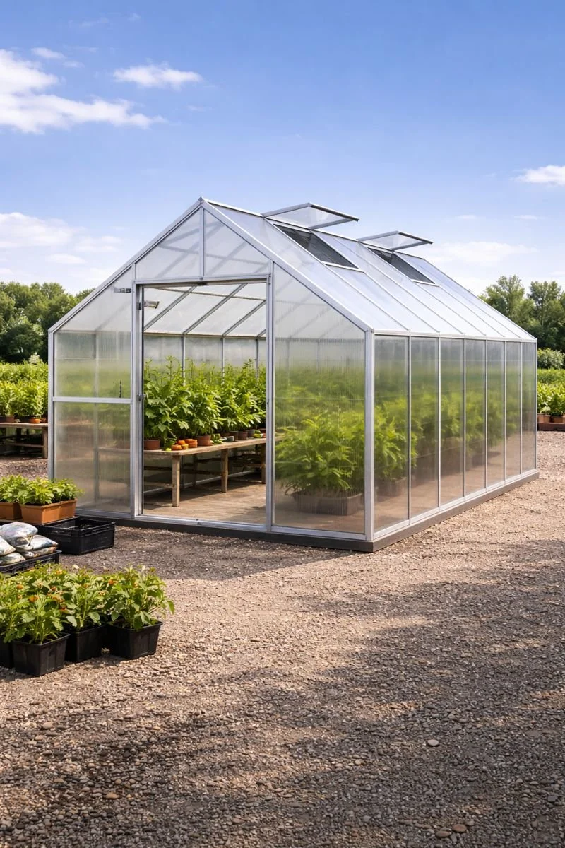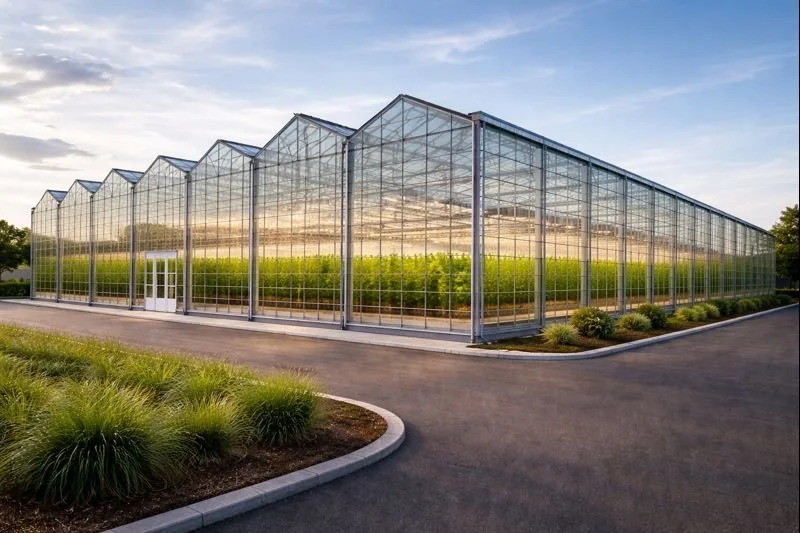 A modern European-inspired greenhouse engineered for efficiency, automation compatibility, and controlled growing performance in commercial operations.