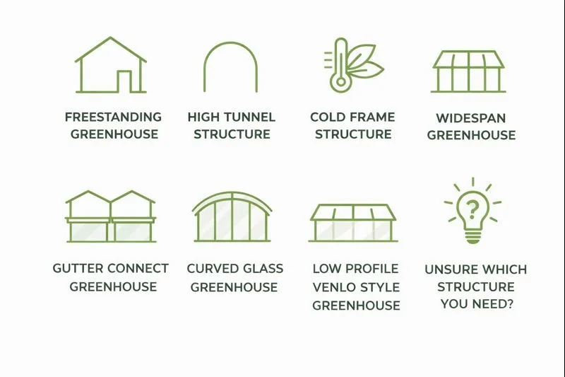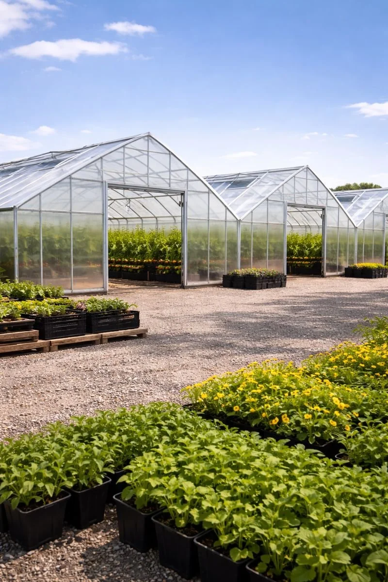 A large-span greenhouse designed to maximize interior growing space with fewer structural supports, improving workflow, light distribution, and equipment access.